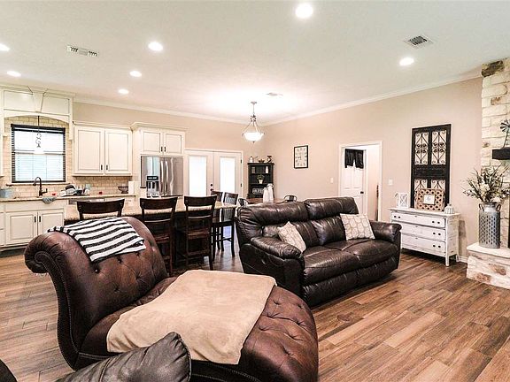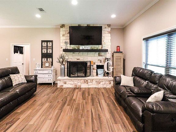 Located at the end of FM 2827 this property boasts 6 acres with a 3 bedroom 2 & half bath house that features cedar siding & stone. There is also a floored attic that could potentially be a fourth bedroom, playroom or a heated & cooled storage room. The outside offers a covered carport, back patio, full basketball court & the slab & plumbing are ready for a shop to be built. Definitely a MUST SEE!!