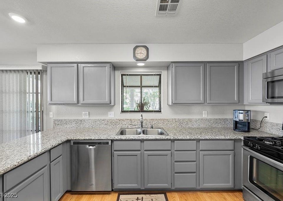 ASK about the 2-1 Buydown opportunity on this property - for 2 years of lower monthly payments!! Through Bill Gaylord NMLS 680603 | NMLS 3029. Welcome to this charming two-story home in the coveted guard-gated Los Prados community. The kitchen boasts granite counters, stainless appliances, a garden window and a cozy breakfast nook. Three bedrooms upstairs keep the main living area open for entertaining or relaxing by the fireplace. Beautiful laminate wood flooring adds elegance and easy care. A separate laundry room with abundant cabinetry offers extra storage. Enjoy low-maintenance desert landscaping, a covered backyard patio for unwinding, and a garage complete with workbench and ceiling storage. This home blends style and functionality in one of Las Vegas’ most desirable communities—don’t miss your chance to see it!