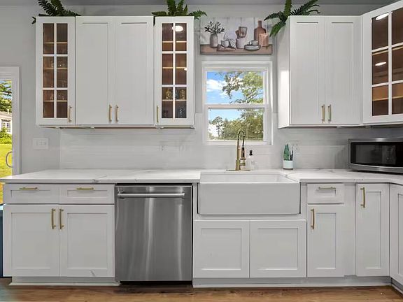 Stylish tile backsplashQuartz countertopsStainless steel appliances