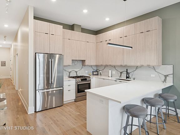 Penthouse Living in the Heart of Bronzeville. Newer construction 3-bedroom, 2-bath penthouse condominium in highly sought after Bronzeville blends sophisticated style, modern comfort, and an expansive private rooftop deck-perfect for entertaining or relaxing with unobstructed panoramic views of the city skyline. Step inside your top-floor condominium to find 11-foot ceilings, oak hardwood flooring, LED and pendant lighting, matte black hardware and rays of natural light pouring through sleek encasement windows. The open-concept layout seamlessly connects the spacious living area (large enough for a cozy sectional), dining space (ample room for an 8-person table), making it ideal for functional everyday living and hosting guests. The kitchen impresses with white quartz counters with breakfast bar for four, stainless-steel appliance suite with hidden exhaust, designer large format porcelain tile backsplash, dual toned flat panel cabinets with modern finger pulls and accented by under-cabinet lighting. Retreat to the primary bedroom, where you'll find a generously sized bedroom that fits a king-sized bed, a walk-in closet with french doors and custom closet organizers, and a spa-like ensuite bathroom with double vanity, a walk-in shower with a traditional and rainfall showerhead, handheld wand, bench, elegant porcelain tile and glass enclosure. There are two additional bedrooms and a second bath. Additional features include a rear balcony, private garage parking, full wiring for security, internet, and cable, as well as upgraded sound insulation between floors-perfect for peace and productivity while working from home. Located just steps from Chicago's beautiful lakefront and Hyde Park's bustling 53rd Street corridor and local favorites: Sip & Savor, Two Fish Crab Shack, Simply Soups & Salads, as well as cafes, galleries, shopping, the Green Line, and Washington Park. Bronzeville - where culture, cuisine, and community meet.