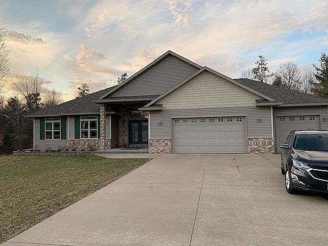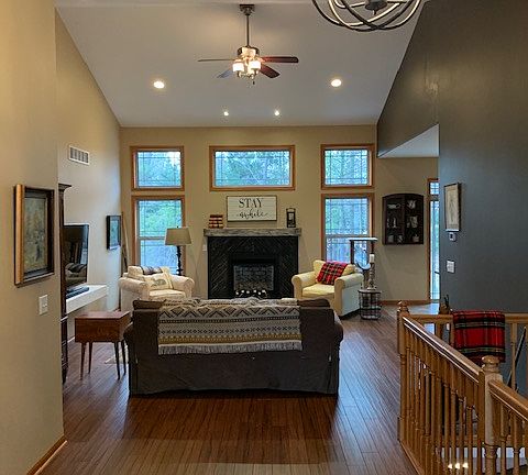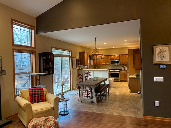 Quality built home on a spacious wooded lot. 4 Bedrooms, 3 1/2 Bath. Dual entry doors from covered porch to 11' ceilings in entry. 14 ft Cathedral ceiling in the great room and 9 ft ceilings on the main floor. Large transom windows throughout. Maple cabinetry, whirlpool tub, Double sink vanity in the Master bedroom with huge walk in closet. Stairs from the basement go to a 29 x 38 garage. New hardwood floor in the Great room and hallway. Drop zone in the entry, Newer kitchen appliances, first floor laundry. Deck and patio with a fire pit. Universal Home Warranty.