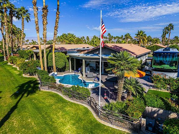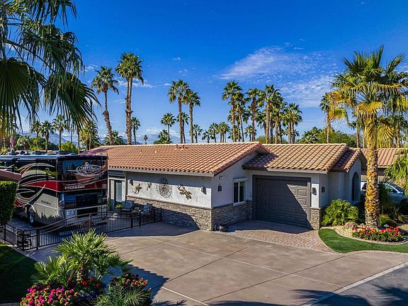 #31 DESERT SHORES RESORTLuxury Motorcoach Resort - Newly renovated property!2 Retreats + 2 En Suites, 1 with a soaking tub. Newer Vinyl Plank Flooring throughout!Newer kitchen with built-in JennAir appliances.Newer Garage Extension on this fabulous Phase 1 property. Situated on Lake One, this Desert Shores Motorcoach Resort Property has soft-modern decor and a dipping pool with boulder waterfall. Association includes clubhouse, tennis, fitness center, community pool & spa, social activities, 24-hour, guard gated with high-tech perimeter security, trailer storage area, doggie park, front yard landscape maintenance & High Speed Internet and new Pickleball courts.