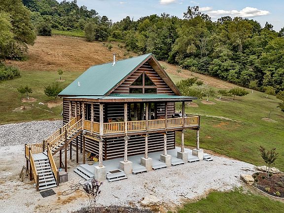 This 50.99 acre tract is a dream homestead w/large two-story log home. The spacious 4 bedroom (3BR septic) 2.5 bath log home has a blend of rustic charm & modern comfort. Step inside to find an open concept living area w/soaring vaulted ceilings & rustic beams, oak hardwood flooring & cozy wood-burning fireplace. Kitchen features neutral tones, leathered granite countertops & stainless appliances. Large windows flood the main living area w/natural light, creating an airy atmosphere w/hill side views. Upstairs loft offers lots of year round views also. Double wraparound front porch offers views of the in-ground automatic chloration system pool surrounded by nature. The solid concrete poured basment walls give superb lower level finished space w/game room, bedrooms, & bath. This large tract has blend of wooded areas excellent for deer hunting & some open pasture with lots of fruit trees. 30 x14 block barn/shop has great storage. Don't miss this opportunity to own this private paradise.