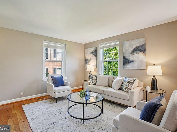 Set back nicely away from the street, this three-level end-unit Clarendon model townhome is surprisingly spacious inside. Gleaming hardwood floors on the main level greet you as you enter through the covered porch entryway, and the main and upper levels are freshly painted in neutral tones. A large living room enjoys abundant natural light due to the end-unit’s additional windows. Dining room is open to the living room and the kitchen, with views out to green space and through the French door to the rear balcony. Renovated kitchen feels open and inviting, featuring elegant white cabinetry stretching to the ceiling, granite countertops and stainless-steel appliances. Upper-level features two spacious bedrooms, a hallway linen closet and a renovated hall bathroom. Spacious primary bedroom boasts tons of natural light and a large closet for plenty of storage. Renovated hall bathroom features tub with gorgeous tile surround, oversized vanity, additional storage and elegant chrome hardware. Lower level features a large rec-room with full bank of built-in cabinetry and full daylight. Spacious third bedroom with full sized window and tons of natural light – not underground due to the topography of the land. Additionally, lower level features the second full, renovated bathroom with storage, and a full-size washer and dryer. Large back balcony overlooks abundant green space and provides ideal outdoor space. Meticulously maintained home has newer systems, appliances, gorgeous landscaping and is entirely move-in ready. Fairlington amenities include off-street parking, abundant green space, parks, pools, community center, tennis/ basketball courts, dog park and more! Amazing Fairlington location can’t be beat; minutes to Washington D.C., The Village at Shirlington which features shops, restaurants, grocery, library, Signature Theater, as well as close proximity to Bradlee Shopping Center, an easy commute via access to I395 and just a couple exits to Amazon’s HQ2 @ National Landing