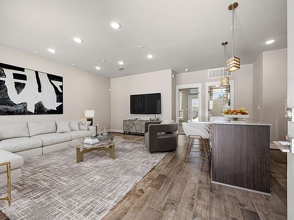 Open concept floor planRich wood flooringLarge windowsQuartz countertopsOversized islandStunning kitchenTwo toned cabinetry