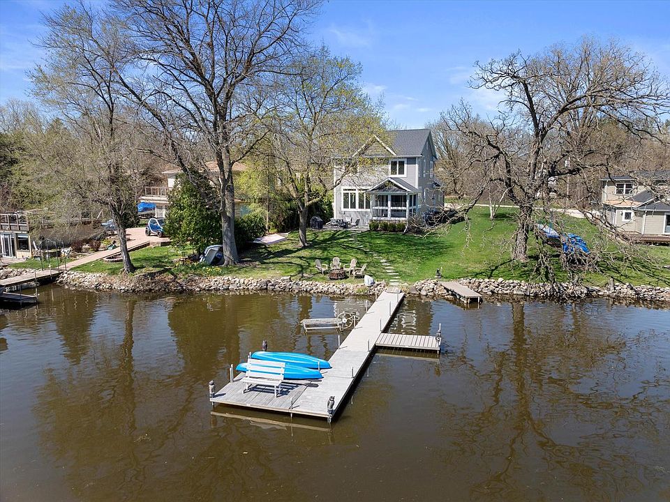 Custom built home on the Fox River in Waterford. Take the river into town or to Tichigan lake. You can ski or tube on the serpentinous river to the beautiful lake. The home has views of the water from virtually every room. The Kitchen features Amish cabinets and granite counter tops with beautiful tile surround. Custom lighting and high ceilings lead to a gorgeous three season porch for views up and down the river. A level lot for entertaining leads down to the frontage. Primary bedroom has a walk in closet and private access to the full bath. Generous sized second and third bedrooms. Main floor laundry. Lower level features a large bar, wine cellar, and plenty of space for entertaining. The area around the pier is shallow enough to wade on a gravel and sand bottom. 7-8'' at the piers end