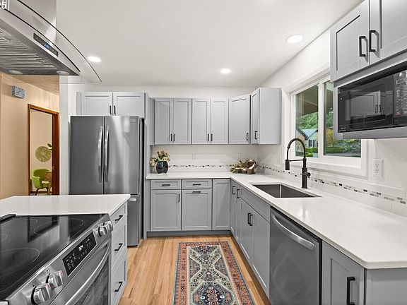 New fence and a 50,000 price reduction!!!! Total remodel of this mid-century home in the heart of the desirable Bridlemile neighborhood. Tucked into a large lot with a pass-through driveway, this home blends timeless mid-century design with thoughtful, modern updates. Inside features a magazine-worthy kitchen with custom cabinetry, quartz counters, spacious island and beautiful oak flooring. The newly added primary suite is a serene retreat with a spa-like soaking tub, double sinks and walk-in shower. The lower level offers a bonus room plus a separate living space with private entry, remodeled kitchenette and full bath, perfect for multigenerational living, ADU potential, rental potential, or the ultimate guest suite. With two fireplaces, refinished oak floors, and light-filled rooms throughout, this home has warmth and character at every turn. Major system updates include a new sewer line, all-new plumbing, updated electrical and much more. Home has a private walking path that leads directly to Bridlemile Elementary, a large lot with new landscaping, expanded deck, and recently trimmed trees. See the full list of features and updates.