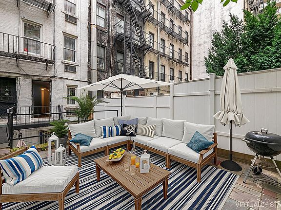 This lovely and quiet studio apartment has been updated and freshly painted throughout. The kitchen was renovated with new white cabinetry, countertop, sink and faucet. A full sized refrigerator and 4 burner stove complete the kitchen space. As you enter the main living area, you see a red brick wall to your left evoking a cozy, prewar feel. This living space can comfortably fit a full size bed, dining table and more furnishings.Below a south facing window in the living area is an in the wall air conditioning unit. There is plenty of wall space for shelving and/or art work in this home. To your right, note a door leading to a spacious, south-facing semi-private patio space. A large area of this patio has been designated for use solely by this unit shareholder. Outdoor furnishings and planters can be placed outside for private use. A sure treat for a studio...three full sized closets! There is a freshly painted bathroom that has also been updated with a new washbasin and faucet. Pets permitted subject to board approval. After two years of residency subletting is permitted with board approval. This cooperative permits a pied a terre purchaser, guarantors and co-purchasing. A capital assessment through April 2026 is for work completed, including a new boiler and other building updates. ( Ask agent for details).