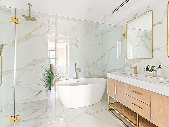 Rear terracePrivate backyardSleek white cabinetryModern designBrushed brass accentsSpa-inspired bathroomFloor-to-ceiling glass doors