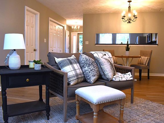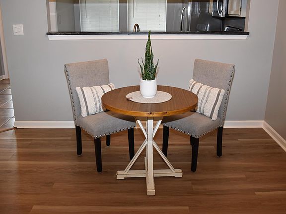 Quiet Lake Community with Lake Vista Amenities and Forest Schools! Welcome to this tastefully upgraded, open-concept townhome, thoughtfully designed to combine elegance and function. A stunning propane fireplace, featuring custom woodwork and granite trim is the heart of the living space, which flows easily out to the back deck. Kitchen is adorned with dark granite countertops and pass-through that seamlessly connects to dining area, enhancing your entertaining experience. Luxury vinyl plank flooring throughout both levels provides both durability and style. The upstairs overflows with storage. The primary bedroom features both walk-in and double closets, the second bedroom provides two additional closets and attic access is pull down. Marble countertop accents full bath's double sink. Layout allows potential for adding second bath. Residents benefit from comprehensive amenities including nearby clubhouse, pool, tennis, lake & all exterior maintenance for a low-maintenance lifestyle.