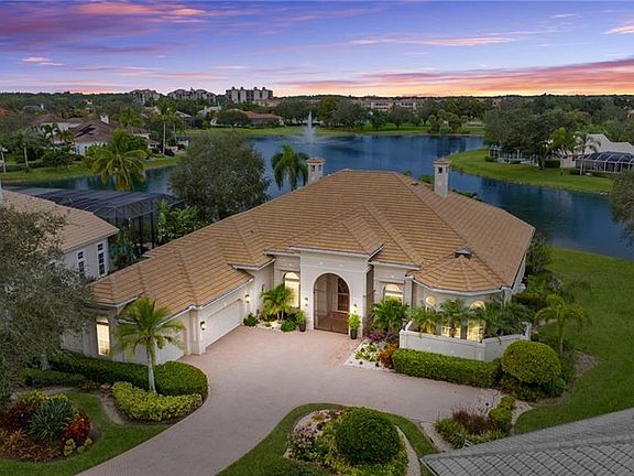 Welcome to one of Naples' most coveted gated Golf Communities - The Vineyards. This grand estate home is located in Terracina, on a private cul-de-sac, featuring direct views of the water, as well as views of Vineyard’s award-winning 36 Holes of Championship Golf. Sitting atop a 2/3 acre lot, this highly desirable Waterford floor plan boasts 4 bedrooms + den, including the oversized primary bedroom suite, 4.5 baths, just under 4,500 SF, with an wonderfully large chef’s kitchen, complete with Taj Mahal countertops, a centric island, and ample seating for entertaining. Attention to detail and superfluous craftsmanship are on display throughout, including the large formal dining room, and the lavish great room with its soaring ceilings. The massive 1,200 SF covered lanai boasts soaring ceilings, and is outfitted with a built-in kitchen, wet bar w/ separate dining and lounge areas, and an oversized pool and spa, all brought together by the built-in LED TV. Additional upgrades include, a new roof (2019), upgraded AC units with extended warranties, new hot water heaters, plantation shutters, shades and complete hurricane protection. The Vineyards is highly regarded as a Top Community in Naples, boasting a fully renovated Clubhouse, Gym and Golf, while conveniently located around everything Naples has to offer.