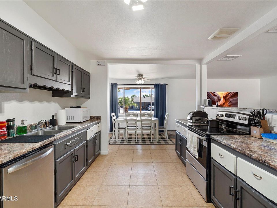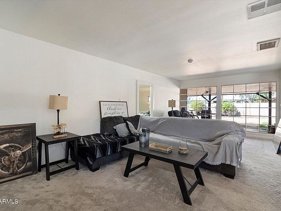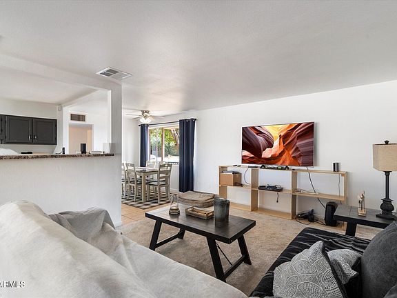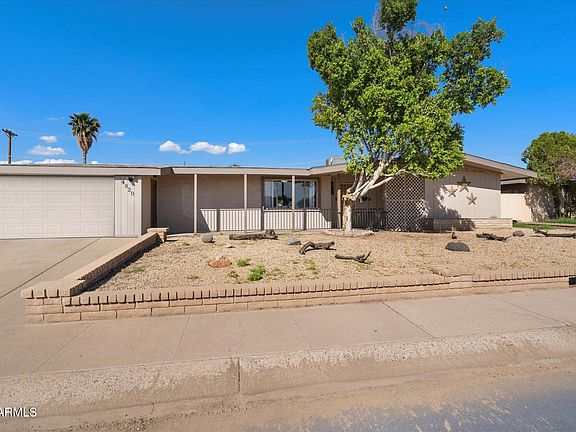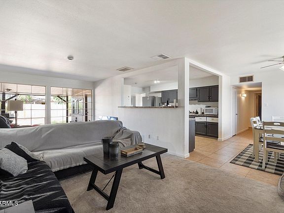 Step into this charming home featuring a popular open concept where the spacious living room, kitchen, and dining areas create a perfect flow for daily life and entertaining. The kitchen comes complete with all appliances for easy move-in. The primary suite offers a unique, convenient layout with direct access to both the laundry room and the Arizona room, plus a connecting bathroom with an updated shower. There are three additional bedrooms and a secondary full bath. Outside, enjoy the large backyard with a covered patio and a storage shed. The location is excellent, providing easy highway access and proximity to the Westgate Entertainment District.