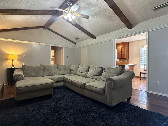 • A spacious living room with vaulted ceilings and exposed beams that create an open, welcoming atmosphere.