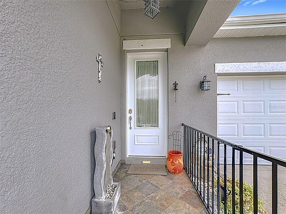 Stunning 4-bedroom, 2-bathroom home with serene lake views and a wealth of upgrades! The spacious kitchen boasts 42" tall cabinets with crown molding, granite countertops, and a convenient built-in desk, perfect for home organization.The remodeled primary bathroom features a soaking tub, double sinks, a walk-in closet, and a Bluetooth-connected exhaust fan system. The second bathroom also includes a fan with built-in music controlled via Bluetooth. Elegant moldings and blinds throughout the home add a touch of sophistication. The great room impresses with a decorative stone accent wall and an electric fireplace, complemented by a stylish barn door, while the entryway features a beautiful stone feature wall.Outdoor living is a highlight, with a screened lanai, extended paver flooring, and a durable PVC fence, ideal for entertaining and enjoying the lake view. The garage includes epoxy flooring, a built-in closet, attic access via staircase, a smart garage door motor controllable via phone, and an exterior keypad.Additional features include a laundry room with new cabinets, washer, dryer, and a new glass door. The home also offers a modern security system with Ring cameras (one indoor, two outdoor), gutters installed 5 years ago, and exterior paint refreshed 3 years ago. Major systems updates include a new roof (2024), water heater (2025), and A/C (2013).This home perfectly combines comfort, style, and functionality, making it truly move-in ready in a desirable location.