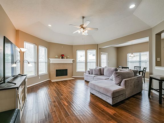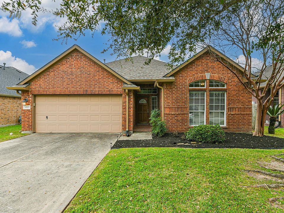 A charming one story open floor plan with the convenience of modern living and functionality. Step into the inviting interior adorn with tile, wood and laminate flooring providing both elegance and durability. The kitchen boasts a gas cooktop, island, granite-look countertops, stainless & black appliances including the refrigerator; catering to your culinary needs. Adjoining breakfast area open to kitchen and familyroom. Also a breakfast bar for convenience. Enjoy the gas fireplace for those cool evenings. Retreat to the comfort of a spacious primary suite with a large walk-in closet, ensuring ample storage. Also washer/dryer remains. Nice backyard and patio area along with outside community amenities including an area pool, basketball court, playground, and even a batting cage for our future Astros!