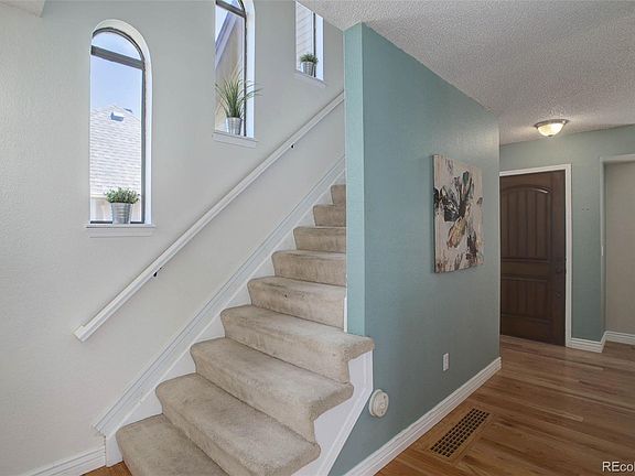 This charming property offers an ideal opportunity as a great starter home. The main level boasts inviting hardwood floors throughout, complemented by a spacious living room featuring a charming bay window and a cozy wood-burning fireplace with a brick surround, perfect for gathering with loved ones. The kitchen is well-appointed with stainless steel appliances, laminate counters, a smooth top stove, pantry, and an eat-in space illuminated by another bay window, overlooking the backyard. Ascending to the upper level, you'll be greeted by vaulted ceilings and vinyl plank floors that lend an air of sophistication. The primary bedroom provides ample space and a large ceiling fan. The Jack-N-Jill full bathroom connects the two bedrooms, while a large hall closet offers additional storage. The finished basement offers versatility with an open rec room, additional bedroom, and a full bath with a deep soaking tub, providing extra living space or potential guest accommodations. Outside, the backyard beckons with a sizable deck, garden space, and leveled ground awaiting your personal touch. Parking is made easy with a 1-car attached, finished garage equipped with shelves for storage. New roof in 2023, new water heater 10/2023, new appliances 11/2023, popcorn ceilings removed upstairs in 2016. Situated in the sought-after Cherry Creek School district and nestled in a peaceful cul-de-sac, this property combines comfort, convenience, and potential, making it an ideal place to call home.