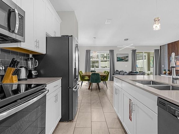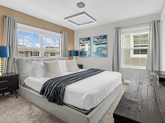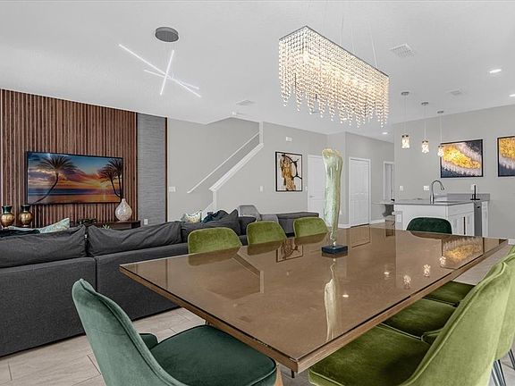 Welcome to an exceptional investment opportunity, PROFESSIONALLY DESIGNED AND DECORATED, in the sought-after Storey Lake Resort! This fully furnished 2019-built corner townhome boasts 5 bedrooms and 4 full bathrooms across 2,128 sq ft of heated space (2,309 sq ft total). This turnkey property is optimized for short-term rentals, delivering a perfect mix of luxury, prime location, and revenue potential, managed by the one of the most prestigious management companies in the area. As an end unit, it maximizes privacy and floods with natural light, complemented by serene pond vistas that create a tranquil retreat for guests. The open floor plan features ceramic tile in common areas, carpet in bedrooms, and a gourmet kitchen with stone counters, solid wood cabinets, and stainless steel appliances including dishwasher, range, microwave, refrigerator, disposal, washer, dryer, and electric water heater—ideal for seamless hosting or post-park relaxation. Outside, enjoy a private heated in-ground pool with child safety fence and screen enclosure, plus irrigation system and tile roof for low-maintenance appeal. Community perks at this guard-gated haven include resort-style pools, lazy river, water slides, mini golf, tiki bar, fitness center, sports courts (tennis, etc.), dog park, playground, and wheelchair access. Strategically situated just minutes from Disney World, Universal Studios, SeaWorld, premium outlets, and dining, this northeast-facing gem offers unmatched convenience. Pet-friendly (verify restrictions) and rental-ready, it's a prime choice for investors or vacationers. Don't miss out—schedule your viewing today and unlock this vacation property's full promise!
