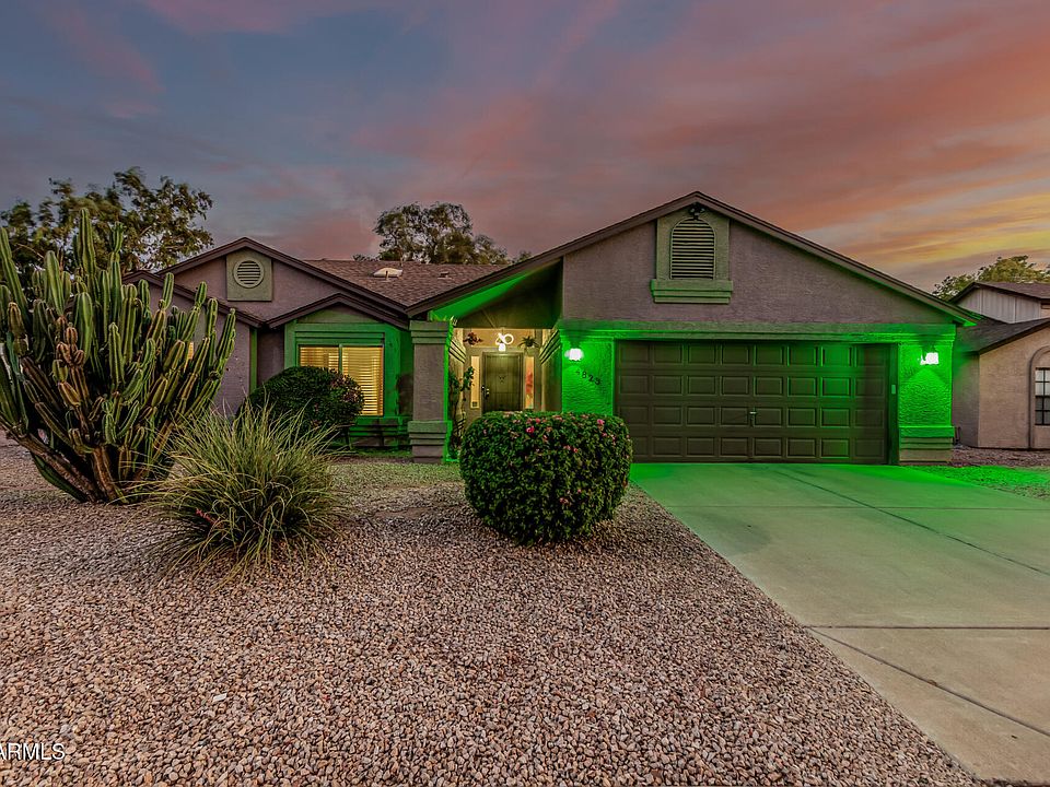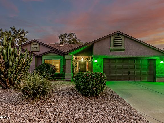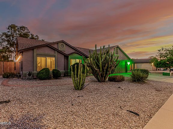 Explore this delightful 4-bedroom home on a quiet cul-de-sac! You're welcomed by a 2-car garage, an RV gate, and a charming desert landscape. Discover a tranquil living room with vaulted ceilings, an earth-tone palette, blinds, and durable tile flooring. The cozy family room is perfect for relaxing evenings with loved ones. The kitchen boasts a breakfast nook, granite counters, chic pendant lighting, abundant wood cabinetry, a tile backsplash, stainless steel appliances, a pantry, and a two-tier peninsula with a breakfast bar. The main bedroom offers soft carpeting, an ensuite with dual sinks, and a walk-in closet. Enjoy enchanting sunsets in the backyard, complete with a covered patio, artificial turf, and a sparkling pool. Make this gem yours today!