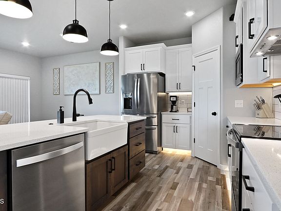 Open floor plan also offers an office and laundry room on the main living level. Kitchen includes matching stainless appliances, subway tile backsplash, quartz countertops, under cabinet and kick plate lighting, and a large island with an apron sink. The primary bedroom has dual sinks, water closet, and clothes closet with more than ample space. Natural light flows freely throughout the main level with the generous 9 foot ceilings and recessed lighting. Every window has been updated with motorized shades.