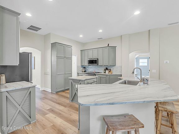 Enjoy luxury Viera living in this stunning 4 bed, 3 bath property in the gated Sonoma neighborhood! The beautifully updated large kitchen features quartzite counters, newer appliances, and a custom pantry cabinet for storage. Huge covered patio & screened in pool are perfect for entertaining. Relax in the master suite with attached sitting area/ office, his & her walk in closets, & fully renovated bathroom with large zero entry shower and free-standing soaking tub. Second bathroom has also been recently renovated, and the third bathroom has convenient access to the pool area. Upstairs you will find a large loft with a screened deck overlooking the pond, perfect as a game room, theater room, or home office. Zoned for highly rated Manatee Elementary, Viera Middle School and Viera High School. Conveniently located to I-95 for easy commutes to the Kennedy Space Center, Patrick SFB, Cape Canaveral SFS, and area attractions such as The Avenues, Cocoa Village, Brevard Zoo, and beaches.