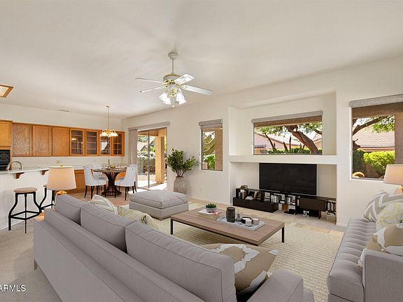 Located in sought after Desert Ridge & just steps away from award winning Wildfire Golf Course this thoughtfully designed single-story great room home offers a split floor plan that is sure to please. Kitchen features expanded cabinets along the wall for added storage, breakfast area, and opens into a large great room. A separate formal dining room could also be used as an office. A spilt floor plan the spacious primary suite features remodeled walk-in shower, & direct access to the backyard. Two secondary bedrooms are separated by a bathroom w/remodeled shower. Backyard is perfect for relaxing & entertaining w/ built-in Viking BBQ, fireplace, & expansive patio space, all set under a shade tree & a stunning saguaro. Walking distance to Desert Ridge Marketplace, High Street, Mayo Clinic & & easy access to 101. Desert Ridge features top rates schools.