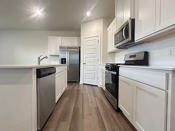 Move-in ready! Gorgeous 4 bedroom, 3 1/2 bathroom home The Element subdivision. Modern, spacious, and well-equipped home with open-concept living areas and luxurious features. Main Floor features an open floor plan combining living, dining, and kitchen areas. Kitchen has a large island, quartz countertops, stainless steel refrigerator, gas range, microwave and dishwasher. Walk-in pantry for ample kitchen storage. One bedroom downstairs with ensuite bathroom. Gas fireplace in the living room. Upstairs: Three large bedrooms with ceiling fans. Primary bedroom with ensuite bathroom, large walk-in closet, walk-in shower. Home overlooks the community pond fountain. 2-car garage.