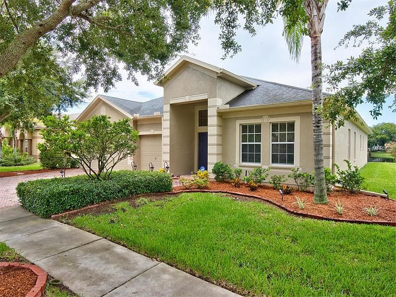 When you enter this lovely home you can't believe how beautiful the view is of the stylish interior, the tranquil view of the lake, and the serene patio...just makes you want to enjoy a cup of coffee and relax! It is an amazing floorplan...4 bedrooms, 3 full baths, PLUS a large den, with a family room AND a living room with adjoining dining room...all great for entertaining! Enjoy cooking in the beautiful kitchen with stylish new stainless appliances...french door refrigerator, chef's slide-in range with dual burners and warming areas, stainless microwave and super quiet dishwasher. The kitchen has new backsplash that consists of stone, stainless and crackle glass to enhance the look of the beautiful granite countertops and 42" deluxe wood cabinetry. You will love the ease of accessing all cupboard areas with slide out shelves, it is just a dream. Easy care on the newer gorgeous 30 yr warranty wood look interlocking flooring that is throughout the house in the den, dining, living and family room and master bedroom. The home has a 3 car garage and elegant paver driveway sits on a premium lot with lovely easier to-care-for landscaping. Lake Talia is a gated community with low HOA fee (and no CDD fee!), playground, basketball court and sheltered picnic area. The home's location is ideal as it's close to Rt. 75 and Veteran's Expressway for easy access for commuting, plus great shopping and dining nearby.