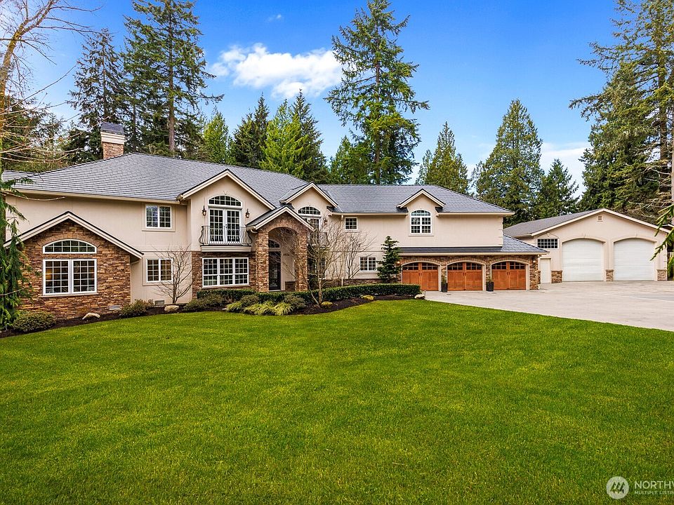 Welcome to your Bothell oasis. Beautiful, sprawling home tucked away on a large lot, surrounded by trees, Northshore Schools. The expansive driveway provides plenty of guest parking while the shop and carport are designed for additional storage, boats, RV's and toys. A huge outdoor covered patio with built-ins is perfect for entertaining or enjoying the peace and quiet. At just under 5,000 square feet, you'll find TWO primary suites, one on the main floor near the office. The kitchen, formal dining and living room are ideal for gatherings. Upstairs, the 2nd primary suite with a fireplace, kitchenette and an amazing spa-like bathroom. Additional office space, a large guest room and an incredible Seahawk family room off the theater room
