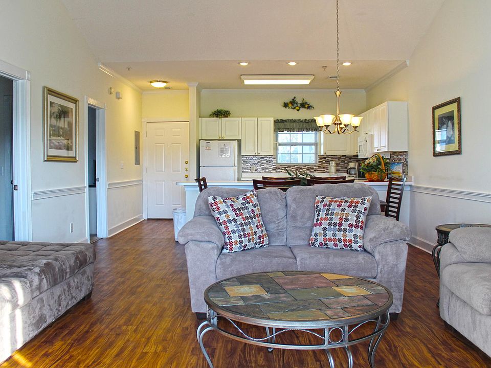 A tastefully decorated living area complete with a flat-screen TV is a great place to unwind after a day enjoying Myrtle Beach. If anyone has a desire to cook, the kitchen is adjacent to the great room and is fully equipped. The master bedroom features a king-swing-sized bed, flat-screen tv, and private bathroom. The second bedroom has two twin beds and a flat-screen TV.