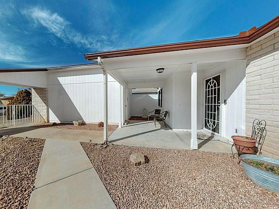 Views, views, views!! Move in ready, 2 bedroom/2bath home with refrigerated air and Sandia Mountain and city views. Primary bedroom with on suite 3/4 bath. Kitchen has eat in dining area with updated stainless steel appliances. Refrigerator stays! Laundry closet and washer and dryer stays! New water heater, exterior freshly painted. One car garage with updated garage door and opener. Large yard with views planters for flowers or vegetables, drip lines and a shed for all your storage needs!