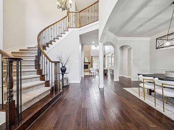 OPEN HOUSE SATURDAY 10.04 FROM 2-4 & SUNDAY 10.05 FROM 2-4PM! NESTLED IN THE COVETED COMMUNITY OF THE BLUFFS! NO PID! HUGE .4 ACRE LOT! WELL MAINTAINED AND MOVE IN READY! Absolutely stunning 4-bedroom, 3.5-bath home with a 3-car tandem garage, set on a spacious .4-acre lot in the highly sought-after The Bluff at Heritage community! Step inside to be greeted by soaring 2-story ceilings, rich wood flooring, elegant crown molding, recessed lighting, arched doorways, and plantation shutters throughout. The open-concept design showcases a dramatic floor-to-ceiling stone fireplace in the living room with views of the upstairs catwalk, plus built-in surround sound speakers for an immersive experience. The chef’s kitchen is a true showpiece with abundant cabinetry, granite countertops, stainless steel GE appliances including double ovens, a center island, and a walk-in pantry.