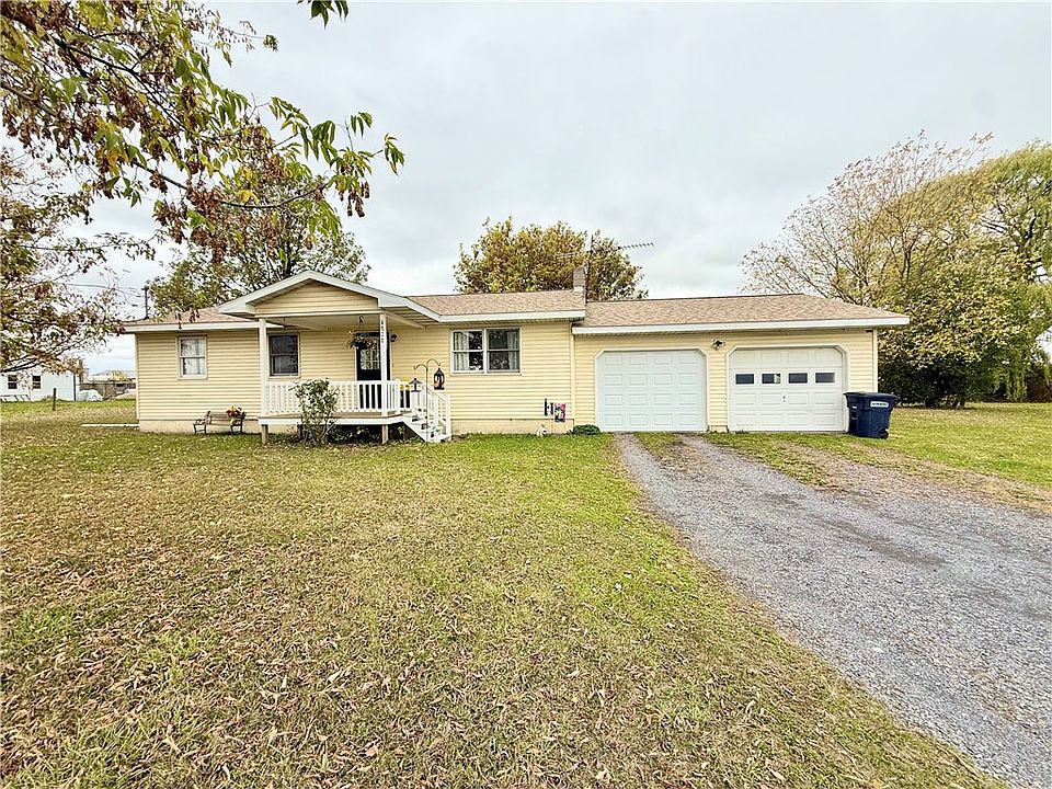 Ranch-style home has been owned by the same family for the past 47 years and sits on a beautiful 1.54-acre lot with scenic surroundings. This easy-to-maintain vinyl exterior home with attached 2-car garage, and long driveway with a convenient turnaround add to its appeal. An inviting covered front porch gives the home a welcoming touch of character. Inside, a spacious front living room flows nicely into the dining area and kitchen, creating an open, comfortable layout. The large eat-in kitchen features custom cabinetry by L.A. Johnson, offering plenty of counter space and storage. A generous dinette area includes built-in shelving along one wall and a French door that opens to a covered back deck — perfect for relaxing or entertaining. Three bedrooms, each with closet space, and a full bath with tub complete the main level. Recent updates include a new roof (2024), new boiler (2023), and new hot water heater (2025). Lovingly maintained through the years, this home is ready for your personal touch and cosmetic updates. Conveniently located near Sampson State Park, Cayuga Lake State Park, and the Seneca-Cayuga Wine Trail, you’ll enjoy easy access to local wineries, breweries, and the NYS Thruway (just 25 minutes away). Come see the potential and charm this long-loved home has to offer — and make it your own!