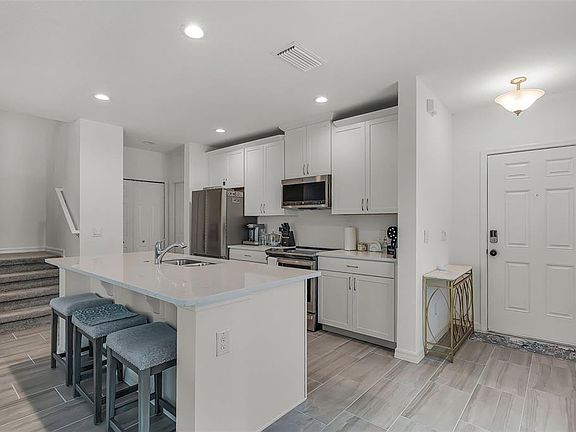 Beautiful Hamilton floor plan, end-unit townhome with serene pond view in Cypress Hammock. With 3 bedrooms, 2.5 baths, and a 2-car garage, this barely lived-in second home offers an open layout with upgraded lighting, a new stair railing, and a screened-in patio for relaxing outdoor living. The kitchen features smart stainless-steel appliances, quartz countertops, and 42" cabinets with crown molding. Upstairs, the spacious primary suite includes an upgraded granite vanity, dual sinks, and a walk-in shower with dual shower heads. While the secondary bedrooms share a Jack and Jill bath. The laundry room is conveniently located upstairs. Community amenities include a resort-style pool, splash pad, playground, sports field, BBQ area, and scenic walking trails—with no CDD fees. Ideally located less than 20 minutes from Disney, with easy access to shopping, dining, and major roads.
