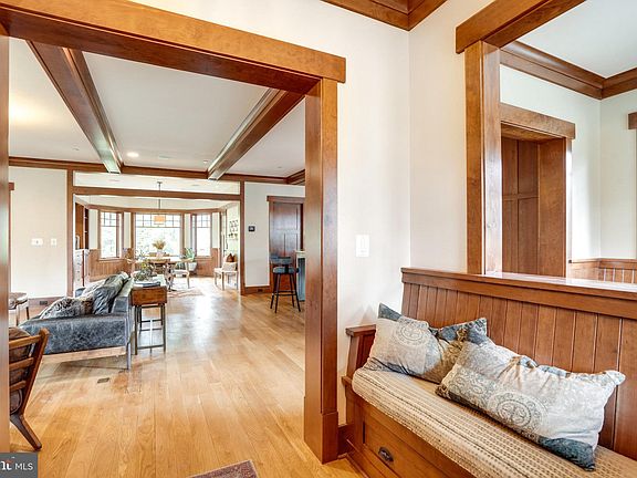 Video and photos are ready for viewing this beautiful craftsman home on the most charming street in Chevy Chase. Desirable multi-generational living with two primary bedrooms and three-level elevator. Beautiful hardwood floors, exposed beams, built-ins, pocket doors, double pane, and wood-framed windows. Inviting porch and front yard. Main level with open floor plan with one of two primary suites, living room, gourmet kitchen, breakfast nook, office/den, dining room, screened-in porch, mudroom, and laundry room. Gourmet kitchen features large prep island with marble countertops, breakfast bar, huge walk-in pantry, dual custom Sub-Zero fridge and freezer drawers, two custom cabinetry dishwashers, two wall ovens, warming drawer, slow closing cabinets and pot filler above cooktop. Breakfast nook has custom built-in table and benches, Living area with wood burning stone fireplace. Office/Den with custom built-in desk and shelving. Primary suite on main level with access to back porch has walk-in closet and bathroom with heated floor, double sink and large steam shower. Hardwood flooring continues to the upstairs bedroom level hallway. The second primary bedroom is on this level, featuring a wet bar/coffee bar, separate sitting room that could potentially be a bedroom or office, curved window wall, custom walk-in closet, large bathroom with doorless shower and walk-in bathtub. The second bedroom on this level is also a suite. Both bedrooms have plenty of light with afternoon sun exposure. There is an elevator access on this level. The basement has a large game room with movie projector, custom made built-in bunk beds, two bedrooms with egress windows and a full bathroom with shower. There are also four storage areas, and elevator access. Back in the main level, the screened porch off the dining room opens to the fenced backyard with view of mature trees. Ample two car garage on oversized driveway with EV charger and access to the mudroom with custom cubbies and built-in bench. Sitting on a quiet no through street, just three houses away from Little Falls Park Trail and short distance to Bethesda Row, Somerset Elementary, Bethesda Outdoor Pool, parks, and Capital Crescent Trail make this beautiful home just perfect!