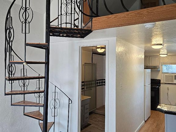 Adorable, clean and cozy loft. Features a bright living/dining area, complete kitchen, modern bathroom, beautiful spiral stair case, window AC, wood laminate flooring, 1 vehicle parking space right outside the front door, small covered porch area. Shared laundry facility in the building, small common area in the back. Located close to UNR, freeway access and downtown Reno. All utilities included in rent. Renter is responsible for cable and wifi if desired. No smoking allowed. Small pet upon approval, if approved, pet deposit required.