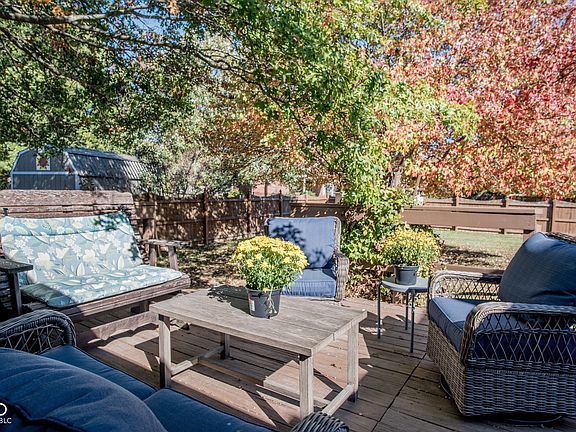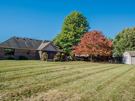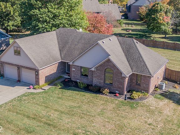 Resting in a desirable custom neighborhood in Pittsboro, this all-brick ranch boasts a large, fenced yard with mature trees and a huge deck. Newer kitchen features quartz counters (for bar stools), tile backsplash, stainless appliances (gas range), raised panel cabinetry with hardware & crown molding & open to the breakfast nook that accesses the back deck via an atrium door. Great room with cathedral ceilings and gas fireplace surrounded by whitewashed, brick hearth. Owner's bedroom with raised, tray ceiling, large walk-in-closet with built-ins and completely remodeled bath with wood-look tile floors, walk-in-shower, dual sinks, quartz counters. All new windows 2023. Water-heater 2019. Water-softener & garage frig included. Stairway to (45'*23') walk-in-attic (perhaps could be finished for more living space?)