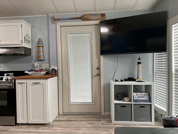 WATERFRONT-Fully Remodeled PARK MODEL LOCATED 3 LOTS AWAY FROM INTRACOASTAL CHANNEL! DOCK IS HEAVY DUTY, AND HAS PILINGS IN FOR BOAT LIFT. PARK MODEL HAS CERAMIC TILE,GRANITE COUNTERTOPS,WASHER/DRYER,GLASS BLOCK PRIVACY WINDOWS, DECORATIVE STONE ON OUTSIDE,STORAGE SHED, COVERED DECK, STEPDOWN PATIO,YARD, Fishing area fenced for extra security. Pergola made of cedar All new appliances and furniture included