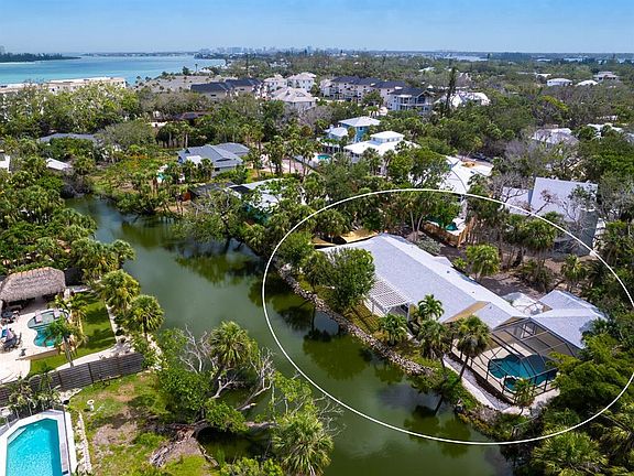 One or more photo(s) has been virtually staged. Tucked away at the end of quiet Estrada De Costa, a single lane road with just three homes, this unique and spacious Siesta Key 3 bedroom/3 bath lakefront property offers rare privacy, flexibility, and charm. Originally built in 1965 and expanded in 2001, the property includes a 2 bedroom/2 bath main house, and a fully equipped one bedroom/one bath separate suite with its own private entrance, cozy living room, kitchen, walk-in closet, and screened porch with tranquil water views. Ideal for multigenerational living, guest accommodations, or income potential. Saltillo(Mexican) tile flooring flows throughout both living spaces and adds character and charm to every room, while the open layout flows seamlessly for comfortable everyday living. Sliding glass doors on the water side fill the rooms with natural light. The house did have water in the home after Hurricane Helene, so the owner completed some thoughtful and stylish renovations such as Shaker cabinets, quartz counters, subway tile backsplash, all new LG stainless steel appliances, new AC, and hot water heaters in both living spaces, and solid paneled doors throughout. New roof in 2022, and drain pipes lines in 2024. Located on Lake Rittwood, a serene neighborhood pond teeming with tilapia, turtles, ducks and birds, this home is a retreat. Stroll into Siesta Key Village, or catch sunset views at the Big Pass/Gulf public access at the West end of Givens St. and Ocean Blvd. This home offers the end-of-the-road seclusion, but still close to the wonderful activities of Siesta Key and Sarasota. Whether you're hosting guests, housing extended family, or exploring rental potential, this unique layout offers flexible living options rarely found on the Key.