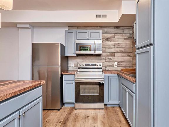 unique touch. Custom lighting throughout creates a warm and inviting atmosphere. The kitchen is a chef's dream with butcher block counters, a center island, and stainless steel