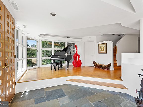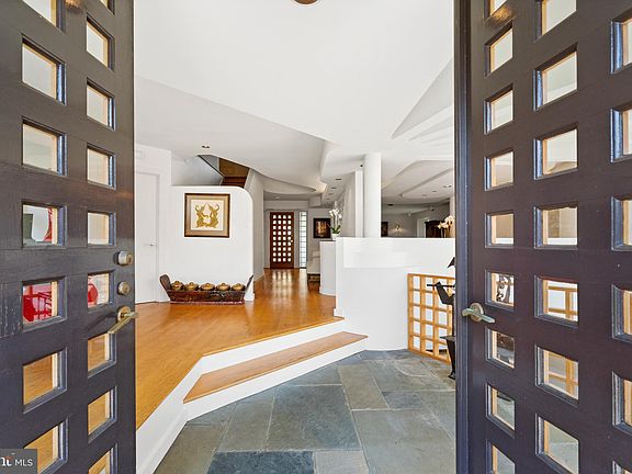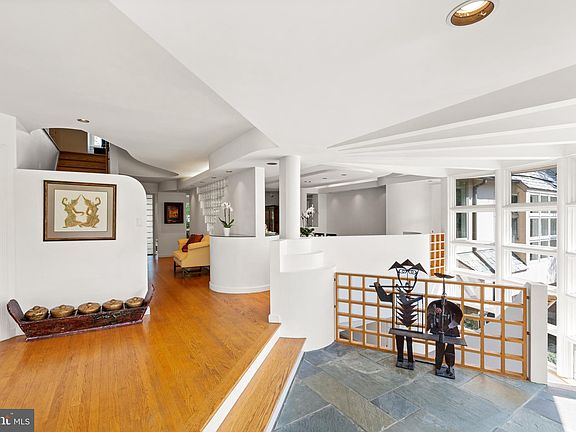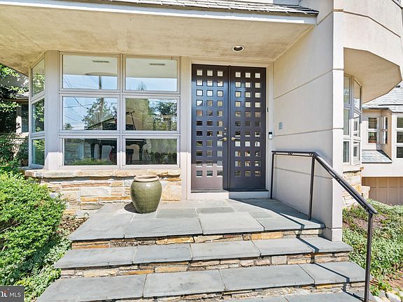 This beautiful contemporary residence is ideally located in the highly desirable Kent neighborhood. Set off the street on a large corner lot, the house captures an abundance of natural sunlight from impressive oversized windows and exposures on all sides. The house was originally designed in 1950 by an architect influenced by Frank Lloyd Wright and has since been renovated and expanded by architect Lloyd Jafvert. Jafvert also transformed the orientation of the residence so that the primary entrance could be from both Loughboro Road and Chain Bridge Road. The house features beautiful architectural details and a wonderful open floor plan, which is perfect for large-scale entertaining. There is an easy flow between the generously-scaled formal rooms on the main level and seamless transition from indoors to outdoors. One of the unique features of this home is the opportunity for MULTIGENERATIONAL LIVING. There is a very attractive private entrance to the left of the front door that opens to a generous suite. The suite offers a large living room with built-ins, a bedroom area, bathroom, kitchenette, and library. The dramatic entry foyer features double wooden doors and a lovely slate floor. It extends a visual invitation to the rear of the home, with sightline views through the gracious center hall and a glimpse of the formal dining room to the right. The sophisticated dining room has a tray ceiling and built-in serving station. It adjoins the formal living room, which offers a beautiful marble fireplace and windows overlooking the grounds. The updated gourmet chef’s kitchen is well-appointed with stainless steel appliances and a dual-sided central island. There is also abundant cabinetry storage, breakfast bar seating, and oversized grid-inspired windows, providing the space with remarkable natural sunlight. The kitchen opens to a breakfast room and then to a family room with an additional fireplace. There is a large bedroom suite and an additional bedroom with an en-suite bathroom completing this floor. The upper level was designed to showcase an exceptionally-scaled primary suite. The bedroom offers a soaring Cathedral ceiling, concealed kitchenette, built-ins, large windows, and exterior access to a private deck. The en-suite bathroom has two sinks, a built-in vanity, walk-in shower, and a separate Jacuzzi soaking tub. The suite also has two-walk-in closets, secondary closets, and a private sitting room. There is an additional bedroom on this floor, which is spacious with its own bathroom. The lower level of the home offers a multitude of flexible spaces, including a large recreation room with a bar and fireplace, a game room, wine room, laundry room, and abundant storage. There is also a garage accessed from this level. The grounds are extensive and offer multiple seating areas for outdoor entertaining. The house is also within close proximity to neighborhood favorite restaurants, shops, and parks.