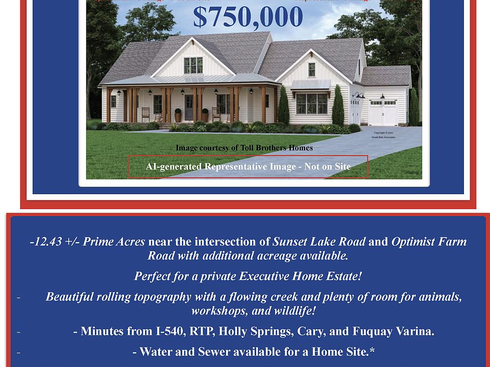 Holly Springs 12.43-Acre Home / Business Site For Sale Prime Location | Development Flexibility | Natural Beauty Discover 12.43± rolling acres ideally situated near the intersection of Sunset Lake Road and Optimist Farm Road, with additional acreage available. This property offers the perfect balance of privacy, accessibility, and development potential. Property Highlights 12.43± Acres of Prime Land featuring scenic topography, mature trees, and a peaceful flowing creek Perfect for an Executive Estate, Family Compound, or Home-Based Business Ample room for animals, workshops, barns, gardens, and recreation Minutes from I-540, RTP, Holly Springs, Cary, and Fuquay-Varina Public Water & Sewer available* Zoning: MXR (Neighborhood Mixed-Use Residential) — allows: Detached & Attached Dwellings Small- & Large-Scale Apartment Dwellings Limited Public/Institutional Uses Limited Commercial Uses This site provides a rare opportunity to create your dream home or pursue a strategic investment in one of the Triangle's most desirable and fast-growing corridors — close to everything, yet surrounded by nature. * Water and sewer availability subject to verification with the Town of Holly Springs.