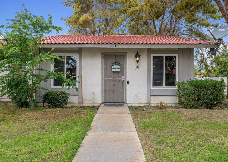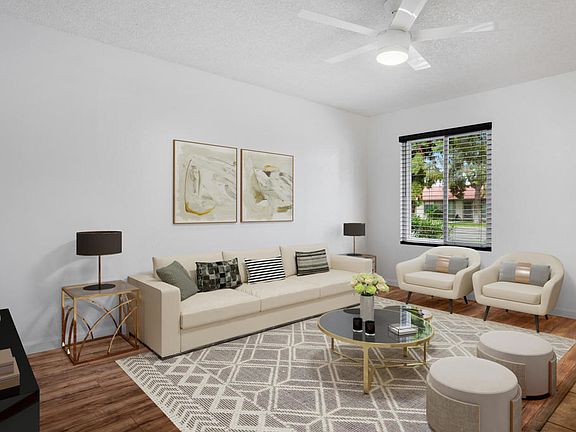 This updated 2 bedroom + 1 bath unfurnished end unit backs to a greenbelt, pool and partial mountain views. Why not make this your full time residency, vacation home and/or short or long term rental. HOA dues include 24 hour security, grounds maintance and exterior building maintenance. Indian Palms has a public 27 hole Championship golf course, tennis courts, bar & restaurant, and community pools. Minutes away from the Coachella and Stagecoach music festivals. All appliances are included. Newer windows & sliding glass door. Note: Furniture is virtually staged. Conventional financing is available. Low HOA dues.