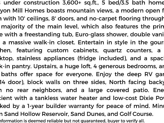 5 bedrooms, 4.5 bathrooms, corner lot, RV garage + additional RV parking space, primary suite with a gorgeous bathroom with double vanity, walk-in tiled shower, soaker tub and walk-in closet, additional ensuite on the main level, grandiose entryway with a beautiful staircase, large open great room, dining and kitchen with lots of windows looking out to the nice sized north facing backyard that has an empty canvas, block walls on 3 sides, quartz countertops, custom cabinets, stainless appliances including the refrigerator, tankless water heater, rain gutters, large loft that leads to a spacious covered balcony with great views, builder warranty and Dixie Power District. All information is deemed reliable but not guaranteed, buyer to verify all.