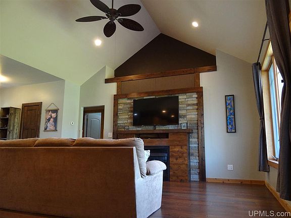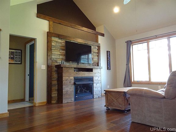 Beautiful, modern, Craftsman style home on over 6 acres of land just outside of Houghton! Located in desirable Stanton Township, this house features 4 BR 4 BA, a full basement, attached garage and much more! You'll appreciate the thoughtful design features throughout. Beautiful hickory and walnut flooring within this welcoming home. Open floor plan through the living room, kitchen and dining area. The living room features a gas fireplace and vaulted ceilings. The dining area enjoys great windows with ample natural light and views of the backyard. The kitchen enjoys alder cabinetry, complimented by imported granite on the counter tops as well as on the large island/sink. Kitchen appliances are included in sale. The master suite features large western exposure windows, hickory flooring, his/hers walk-in closets, and a fantastic master bath with a walk-in tile shower, solid surface counter tops with double sinks, and an amazing Chroma Therapy Tub with radio! Convenient main floor laundry with plenty of storage for your cleaning supplies and miscellaneous items. The basement features a poured foundation, and gives you so much additional space to enjoy! Large family room with great southern views, bonus kitchen area, sliding barn doors, recreation space and more. A large office is within the basement with privacy to get your work done. Additionally, there is a beautifully tiled full bath, as well as a sauna that includes another shower and changing room. There are even two more potential bedrooms that could be finished to fit your growing family if needed. Brand new high efficiency propane boiler in 2020. Warm in-floor heat throughout the basement and garage. Outside you'll enjoy your time on the front covered porch, as well as the large back deck overlooking the backyard. Country living on over 6 acres with privacy pines along the quiet country road, and ample natural light throughout the attractive property. Enjoy the space of living on acreage, but yet just mere minutes from everything that Houghton/Hancock have to offer. So much character and charming details throughout this home, and it is waiting for you!