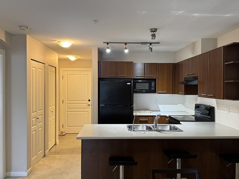 Welcome home to Macdonald House, located in the highly desirable Brentwood community. This warm and inviting condo features an open-concept floor plan with over-height ceilings and windows that fill the home with natural light and fresh air. The living area includes a gas fireplace and opens onto a private balcony overlooking a quiet, tree-lined courtyard, perfect for relaxing evenings indoors or outdoors. The kitchen is thoughtfully designed with rich wood cabinetry, quartz countertops, updated appliances, and a peninsula with seating, creating a perfect space for everyday cooking. Residents of Macdonald House enjoy access to a state-of-the-art fitness centre and a hot tub.