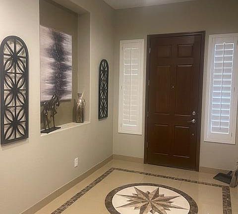 to dawn. Your front entrance to this lovely abode has a conversation area complete with a fire pit to enjoy a quiet conversation with your family, or invite the neighbors to join you. As you enter your home you enjoy stunning marble floors throughout. Your living room windows look directly out to the fabulous backyard and white wood shutters are throughout.