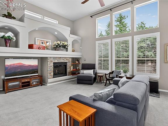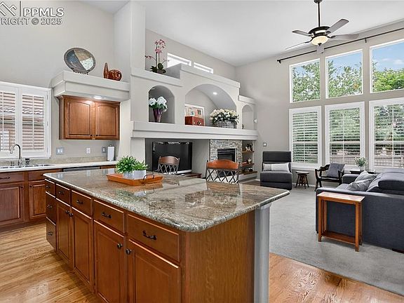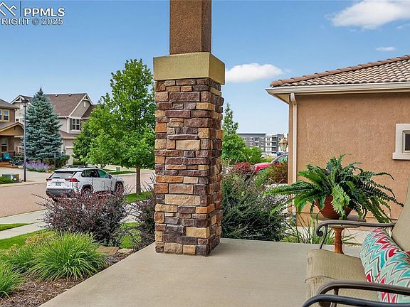 Within the vibrant Cordera community, this thoughtfully crafted ranch-style home blends everyday comfort with timeless design. Curb appeal shines with a stucco & stone exterior, accented by upgraded columns and inviting covered porches at both the front and back. Take in views of Pikes Peak from the front porch while enjoying the sun-filled warmth of the south-facing lot. Step inside to a vaulted living room that feels open and airy, where built-in shelving & a cozy fireplace create a natural gathering space. The layout flows effortlessly into the kitchen which is perfect for everyday living or entertaining. A hot water tap, oversized granite island with bar seating and pullout trays, upgraded cabinetry, & a walk-in pantry offer function and style while cooking. Hardwood flooring complements the stainless steel appliances, including a brand-new dishwasher, stove, and disposal. Around the corner, the dining room features hardwood floors, a tray ceiling, and updated lighting for a polished finish. The main-level primary suite is a true retreat, complete with a tray ceiling, walk-in closet, 3-sided fireplace, & walkout access to the covered patio. The attached 5-piece bath includes a dual vanity, oversized garden tub, & walk-in shower with built-in bench. Completing the main level, a dedicated office with French doors & built-in shelves offers a quiet place to work or study. Downstairs, the finished basement welcomes guests or relaxation with 9-foot ceilings, a spacious family room featuring built-ins, a gas fireplace, a wet bar with microwave, & 2 additional bedrooms. Thoughtful touches continue throughout with plantation shutters on the main level, a laundry room with utility sink, a brand-new water heater with Hydrojet upgrade, & anew furnace. The garage has been thoughtfully insulated & drywalled as an additional feature of this home. Residents of Cordera can enjoy the parks, trails, & year-round activities with great access to local amenities.