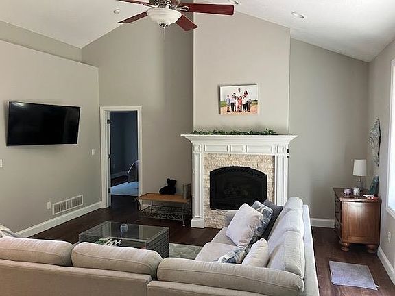 Gas fireplaceStone retaining wallsOpen floor planPrimary suiteCovered front porchProfessional landscapingMaintenance-free siding