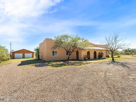 Beautifully maintained Santa Fe-style home on an acre! This spacious 5-bedroom, 3.5-bath home offers a split floor plan with two master suites on one side, perfect for multigenerational living or guest privacy. Enjoy updates throughout, including a new water heater, freshly coated and sealed roof, re-stuccoed exterior, and new paint inside and out. The detached oversized 2-car garage provides plenty of room for vehicles or a workshop. The fenced backyard is ideal for entertaining or relaxing, and RV hookups are available for added convenience. A true desert gem offering space, comfort, and style!