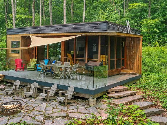Fabulous Lake Vernon property as featured in Cottage Life Magazine. This is the quintessential "Little Cottage by the Lake" with a spacious newly built boathouse that was thoughtfully designed to be a focal point of the property. A sophisticated dryland boathouse with 1300 sq ft of entertaining area on the lake & 450 sq ft dock, plus upper deck with glass rails and Duradeck flooring for sunbathing, lounging and panoramic views. This stunning new build on permanent steel beams features roll down glass doors, front awning to keep the southern sun cool and the rain out and more! Ample seating space, a bar, and more to spend your days "on" the lake. The beautiful cottage was architecturally designed and is perfect size for cooking together, enjoying movie nights by the fireplace, hang out or read in the Muskoka room but never be too far away to stay connected. If you decide in future you want more space, the septic is for 3 bedrooms so add on. Outdoors you have endless space with 14 private acres to explore and 230' of big lake shoreline. 40 miles of boating and 10 minutes to your private dock and parking spot and the docks of downtown Huntsville to visit the shops, restaurants and cultural events. This property is nestled in a cove which remarkably does not get the crashing waves and winds of the big lake. This cottage is designed and finished looking like a "Dwell" magazine cover. High end plywood interior, 12' ceilings in main rooms, 10' in bedrooms, 95 sq.ft. loft is an ideal hideaway or napping spot for the kids. In floor heating in the bathroom, convection and pellet stove to keep you comfortable, spray foam insulated, upscale copper mesh screens, Duradeck decking with glass railings, landscaped with granite stairs...so much quality here. Comes furnished and ready for holiday. Great snowmobile area with the lake trail not far away. Also has an attractive and functional shed near the lake for your water toys and gear. Enjoy multi seasons on your island retreat.